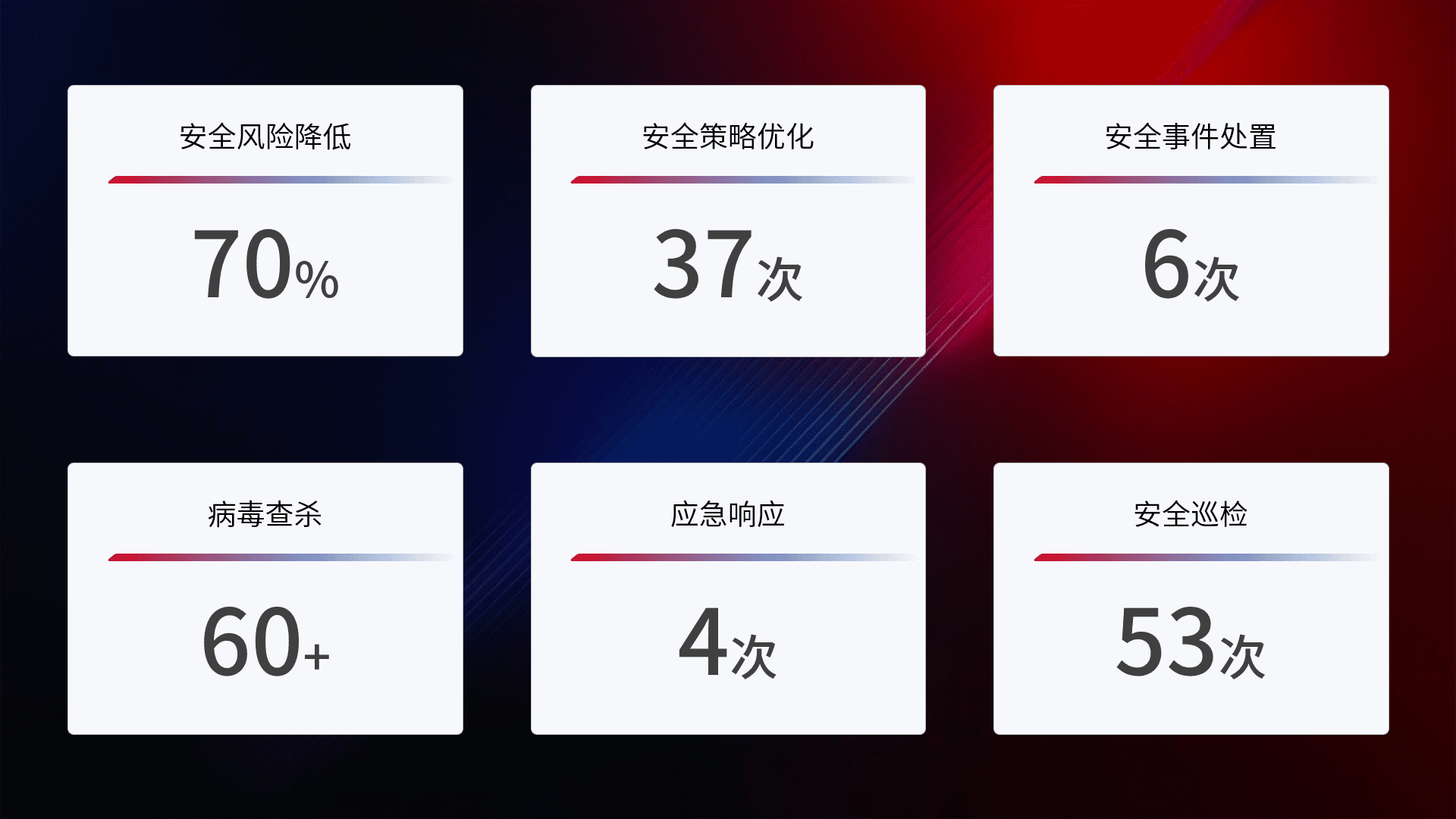提供全面的安全事件报告体系,,,,包括处置报告、、、周报、、、季度和年度总结,,,结合持续监控,,,,帮助客户深入了解网络安全状况。。